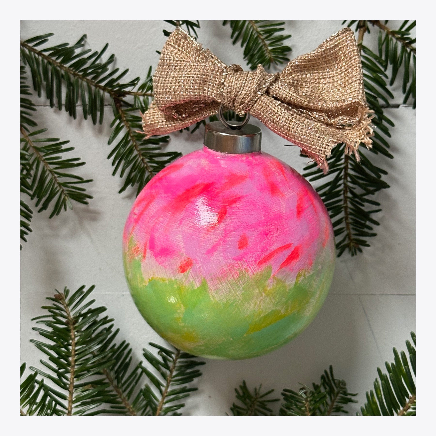 Hand painted in shades of pink, vermillion, mint, and chartreuse these ornaments evoke the a spring day at sunset.