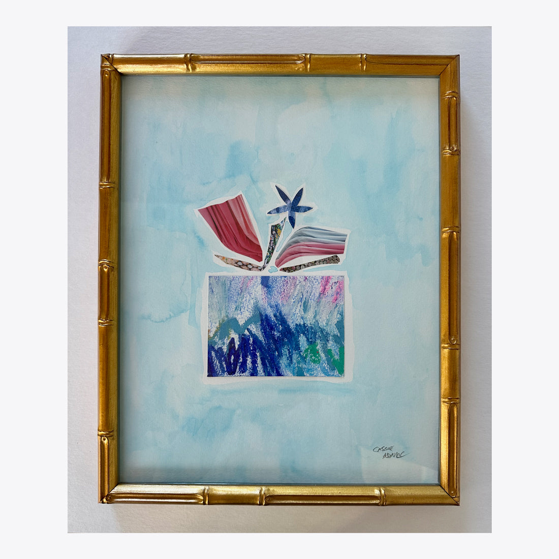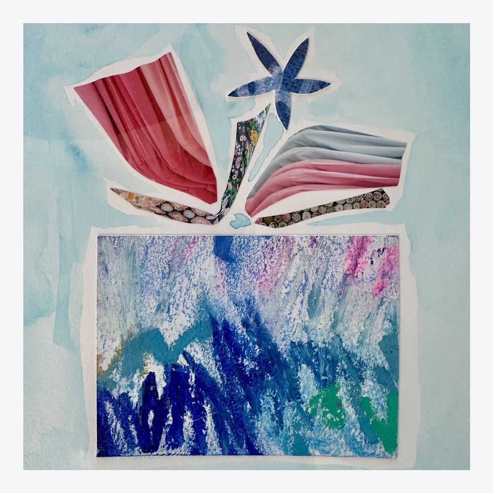 14" x 11" // Watercolor, collaged cut paper and mixed media oil pastel vessels. Year 2025.