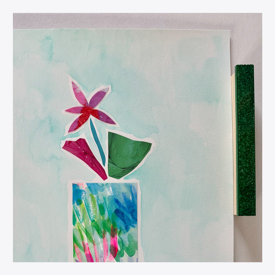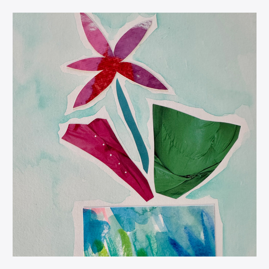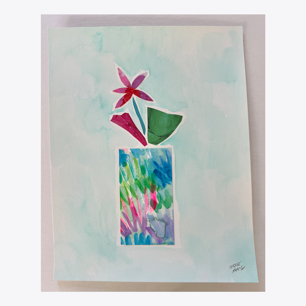 14" x 11" // Watercolor, collaged cut paper and mixed media oil pastel vessels. Year 2025.